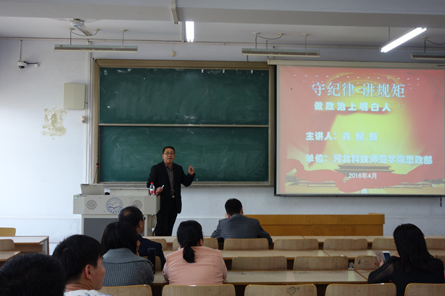 2016年4月28日下午,beat365在1-C-207举办了“增强规矩意识,助力转型发展”主题宣讲活动。本次宣讲由校党委宣传部宣讲团专家、思想政治教育教学部肖继新教授主讲,beat365中文唯一官网教师及120名同学参加本次讲座。
