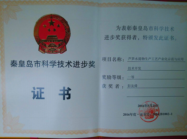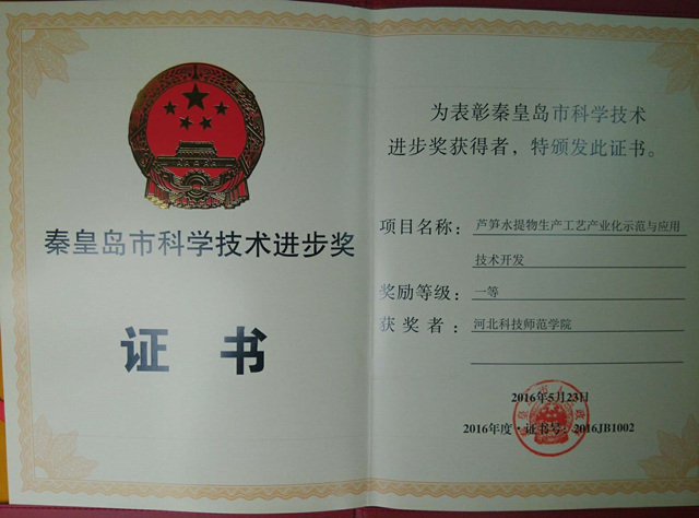 日前,beat365beat365中文唯一官网院长彭友舜教授主持的《芦笋水提物生产工艺产业化示范与应用技术开发》课题荣获秦皇岛市科学技术进步奖一等奖。