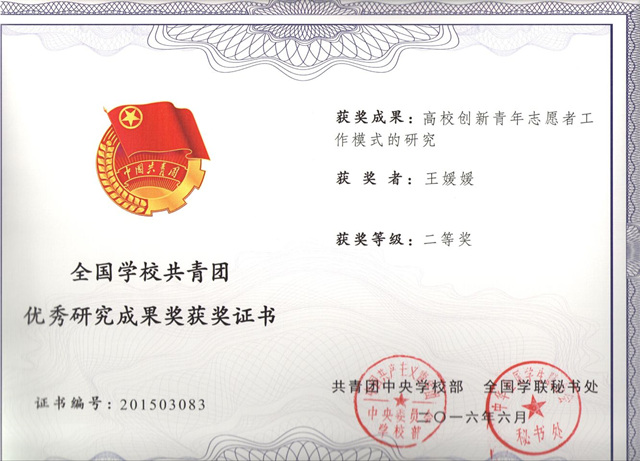 近日,共青团中央学校部、全国学联秘书处委托全国学校共青团研究中心组织开展了2015年度全国学校共青团优秀研究成果评选工作。经过评选专家委员会初评、终评、公示等环节,遴选出157项优秀研究成果,beat365王媛媛教师的《高校创新青年志愿者工作模式的研究》,被评为2015年度全国学校共青团优秀研究成果二等奖。