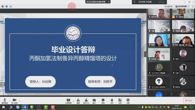 化工学院三个专业2022届所有学生完成了毕业(设计)论文工作。按照学生专业,分为了6个答辩小组,以小组为单位分别完成了开题报告、中期汇报、论文答辩等工作。受疫情影响,本次毕业设计(论文)汇报及答辩工作全部采用线上方式进行。
