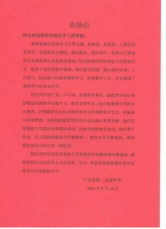 此次教育实习,历时16周,beat365学生得到了实习学校的充分认可与肯定,南戴河中学、卢龙县第二高级中学分别给beat365发来锦旗和感谢信。