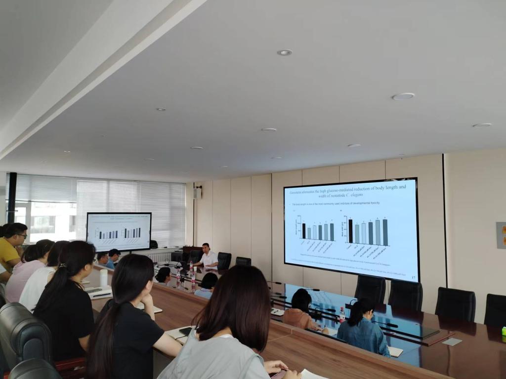 徐宝军教授是英国皇家化学会会士、讲座教授,博士生导师,珠海特聘学者,在Food Research International、Food Chemistry等众多知名国际学术期刊担任副主编或编委,2020-2023年连续四年入选全球前2%顶尖科学家“终身科学影响力”和“年度科学影响力”榜单,并入选世界顶级生物与生化科学家榜单,在食品科学界有着广泛影响力和卓越贡献。徐宝军教授以“大豆异黄酮genistein通过PI3K/Akt信号通路改善高糖神经细胞损伤的分子机制研究”为题,介绍了课题组利用神经元细胞损伤模型和高糖饮食诱导的线虫模型揭示高糖神经损伤发生机制以及大豆异黄酮神经保护机制的相关成果,对与会教师和学生的科研思路带来了深刻的启发和指导。